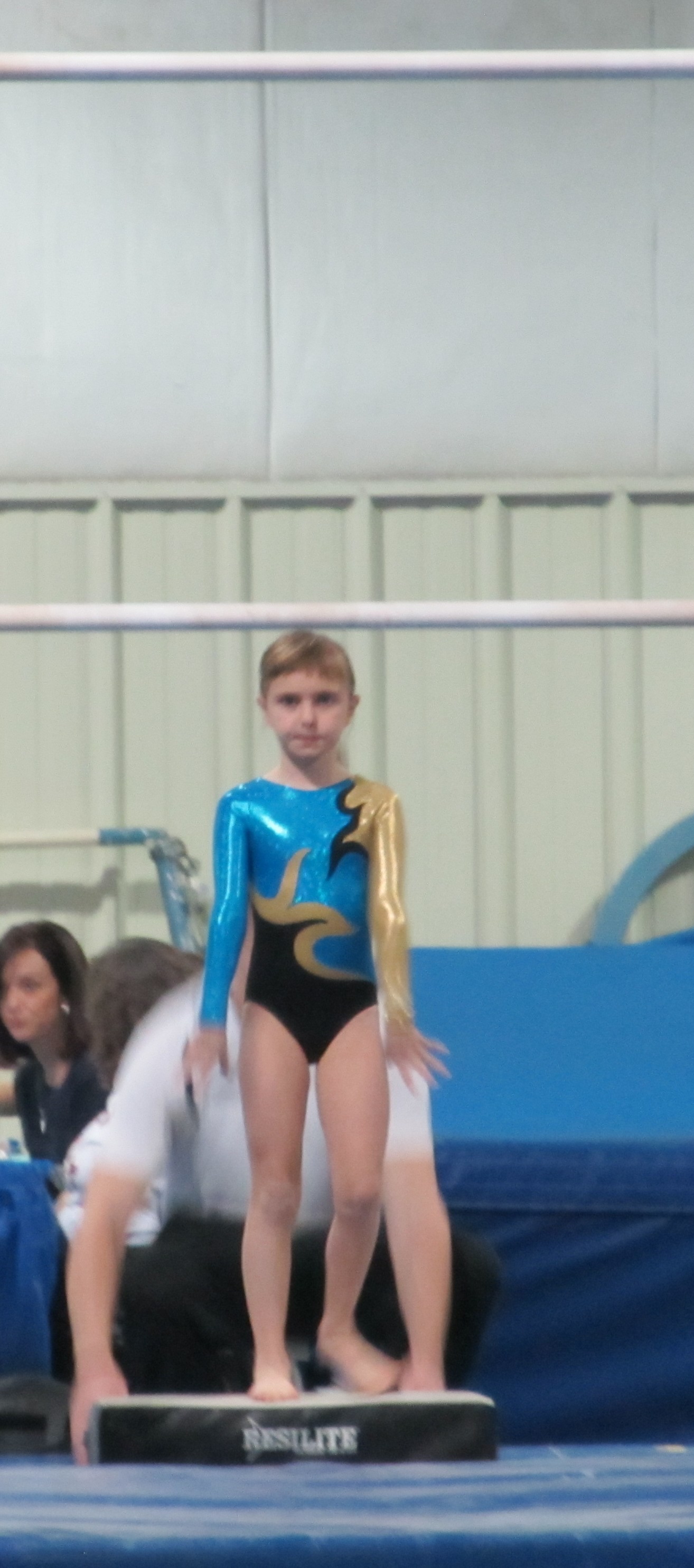 Level 5 gymnast prepares for her first meet; she will have to jump to the high bar, twice as high as she is.