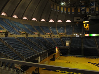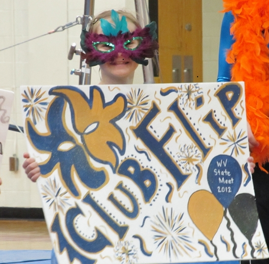 Can you find the gymnast in this photo? There are two. Each year we enjoy the WVGTC meet in Morgantown, WV, home of WVU and the Mountaineers. This year we stopped off at the University and gave kids a glimpse of the WVU Colosseum and Cary Gym to hopefully encourage a college education.