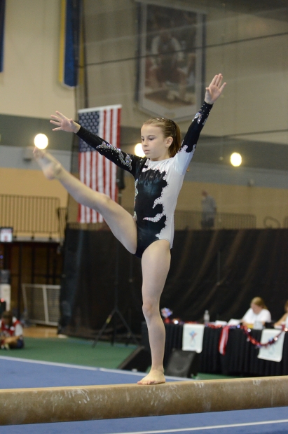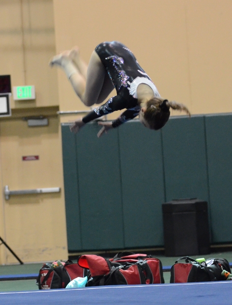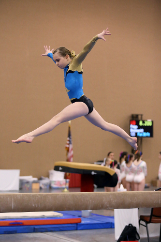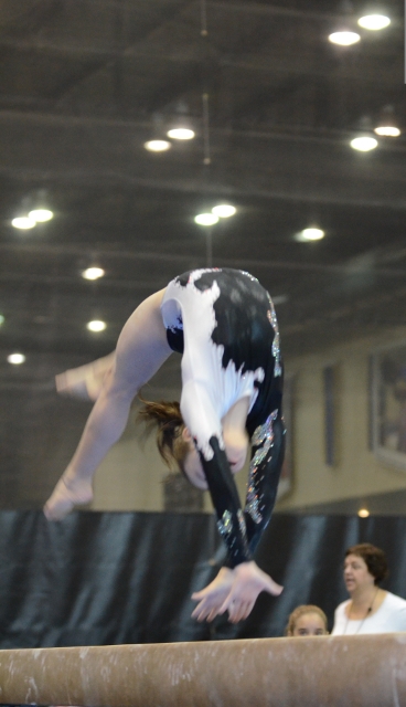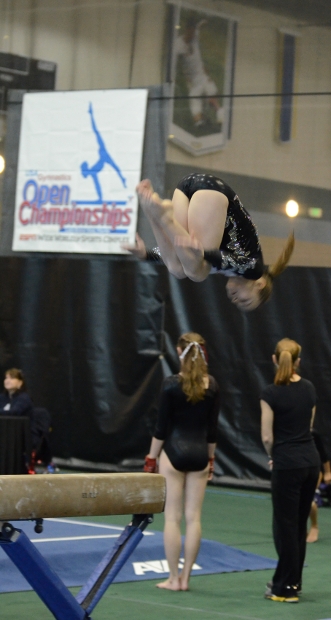 Jodi performing her Level 7 beam dismount with USAG Open Championship Banner in the background - nice height Jodi!
