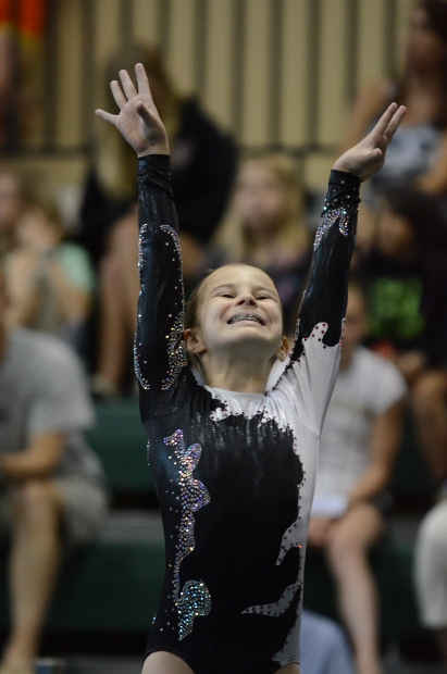 Confident and proud; after lots of hard work, she is finally scoring well on beam.